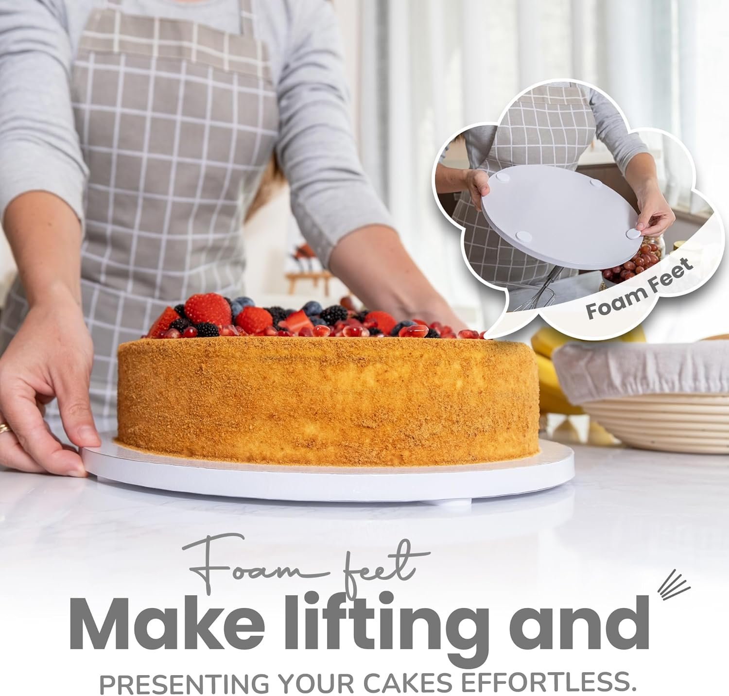 - Extra Kit: With the provided adhesive foam circles, you can affix them beneath the cake plate to create a convenient space, enabling effortless lifting and movement. Additionally, the included satin ribbon can be applied to the edges to enhance your creations with an elegant and refined touch, if desired. Our cake drums are meticulously crafted, fully covered with premium greaseproof glossy foil, allowing for DUAL-SIDE USE.