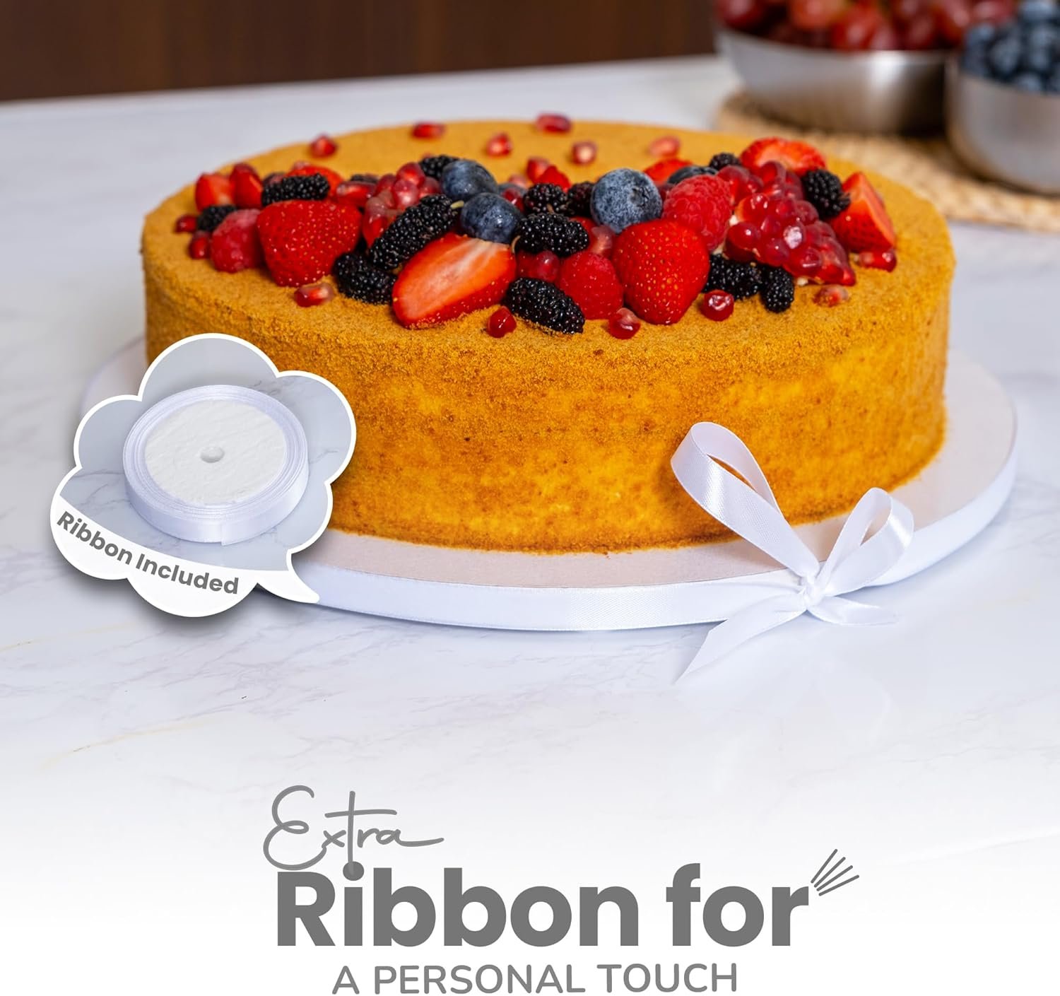 - The Ideal Product: Carefully packaged in a sturdy cardboard box, they are designed to reach you in pristine condition. Cake boards 8,10.12 inch round, straight edge, dual-side use, recyclable materials. This set includes foam feet and a decorating ribbon. Our smooth-edged cake plates are meticulously crafted, fully covered with premium greaseproof glossy foil, allowing for dual-side use. Although they are disposable, these can be wiped clean and reused. White cake boards made of sturdy corrugated cardboard sheets.